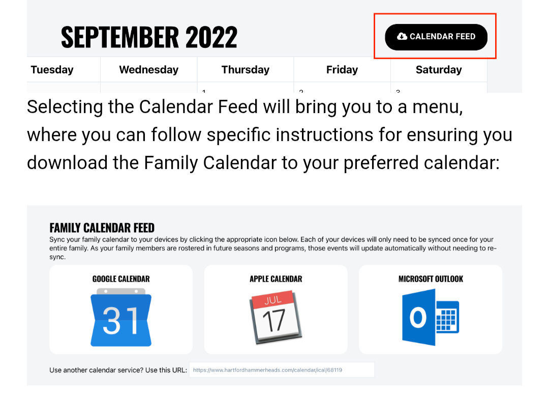 To sync your calendar to your personal device from your club's website, you'll ensure you are logged in, then navigate to the Family Calendar at the top left of the site. From there, you'll see the full calendar of events for all of your teams or participants, with the option at the top right of the screen to download a Calendar Feed. Selecting the Calendar Feed will bring you to a menu, where you can follow specific instructions for ensuring you download the Family Calendar to your preferred calendar (see image below).